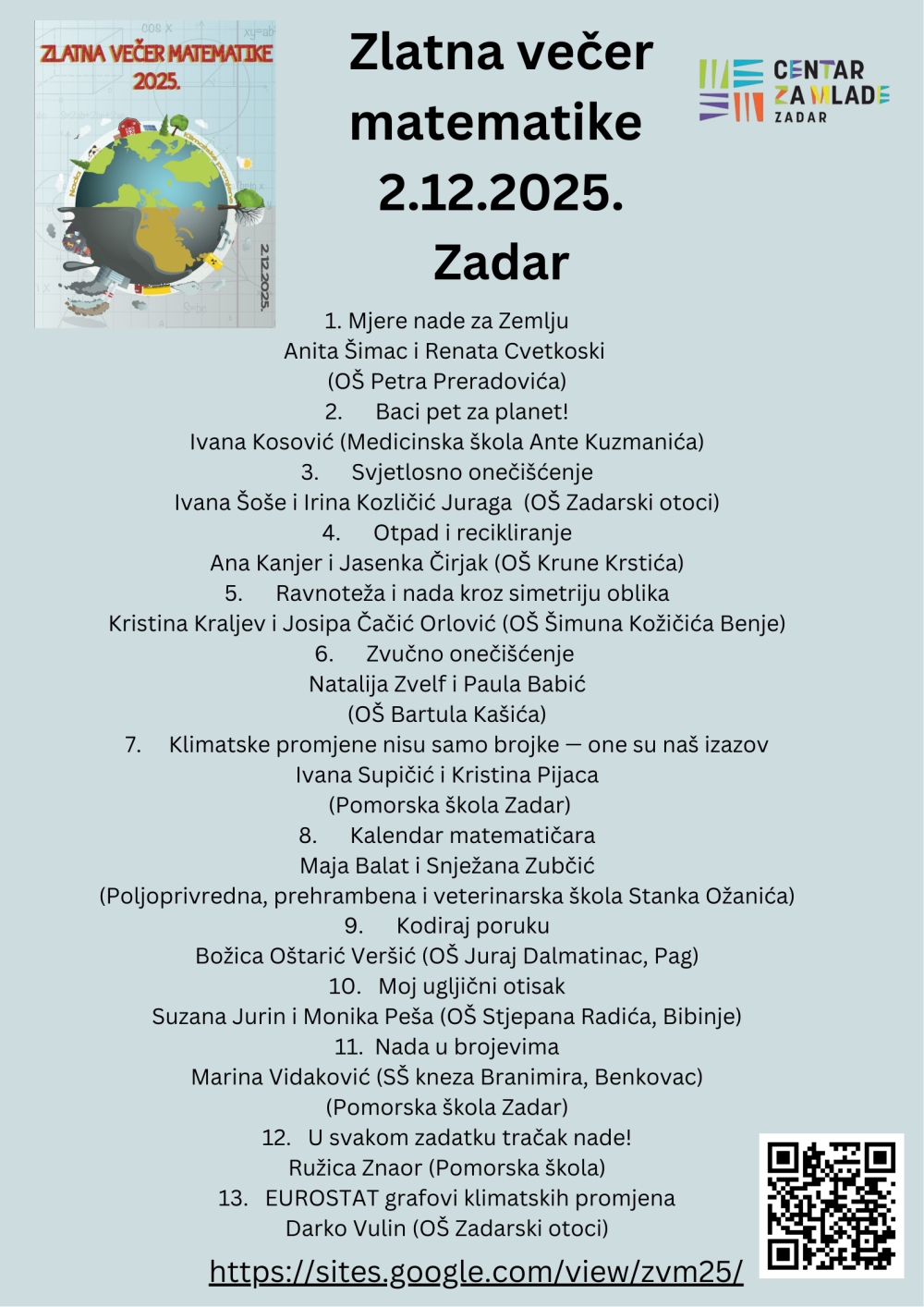 Dođite u Centar za mlade Zadar u utorak 2. prosinca 2025. godine u 17:00 na Zlatnu večer matematike!