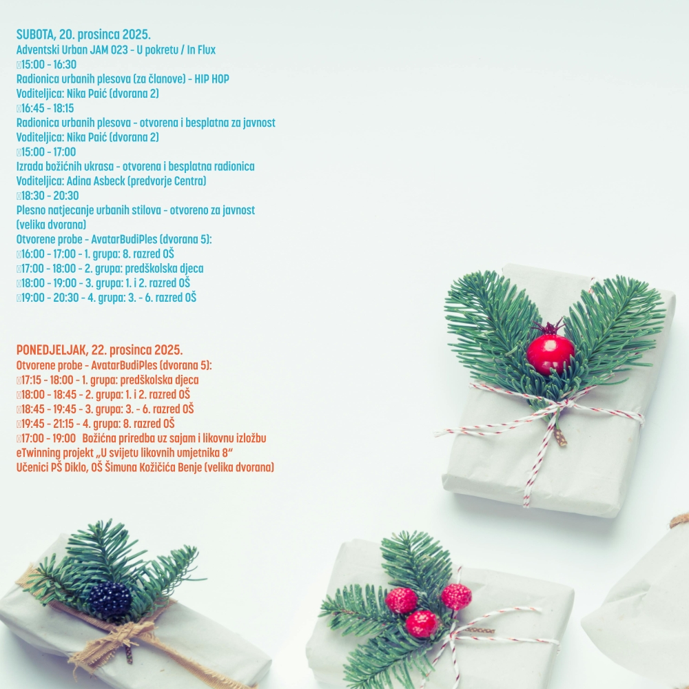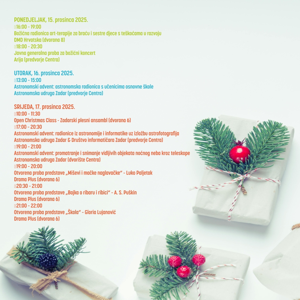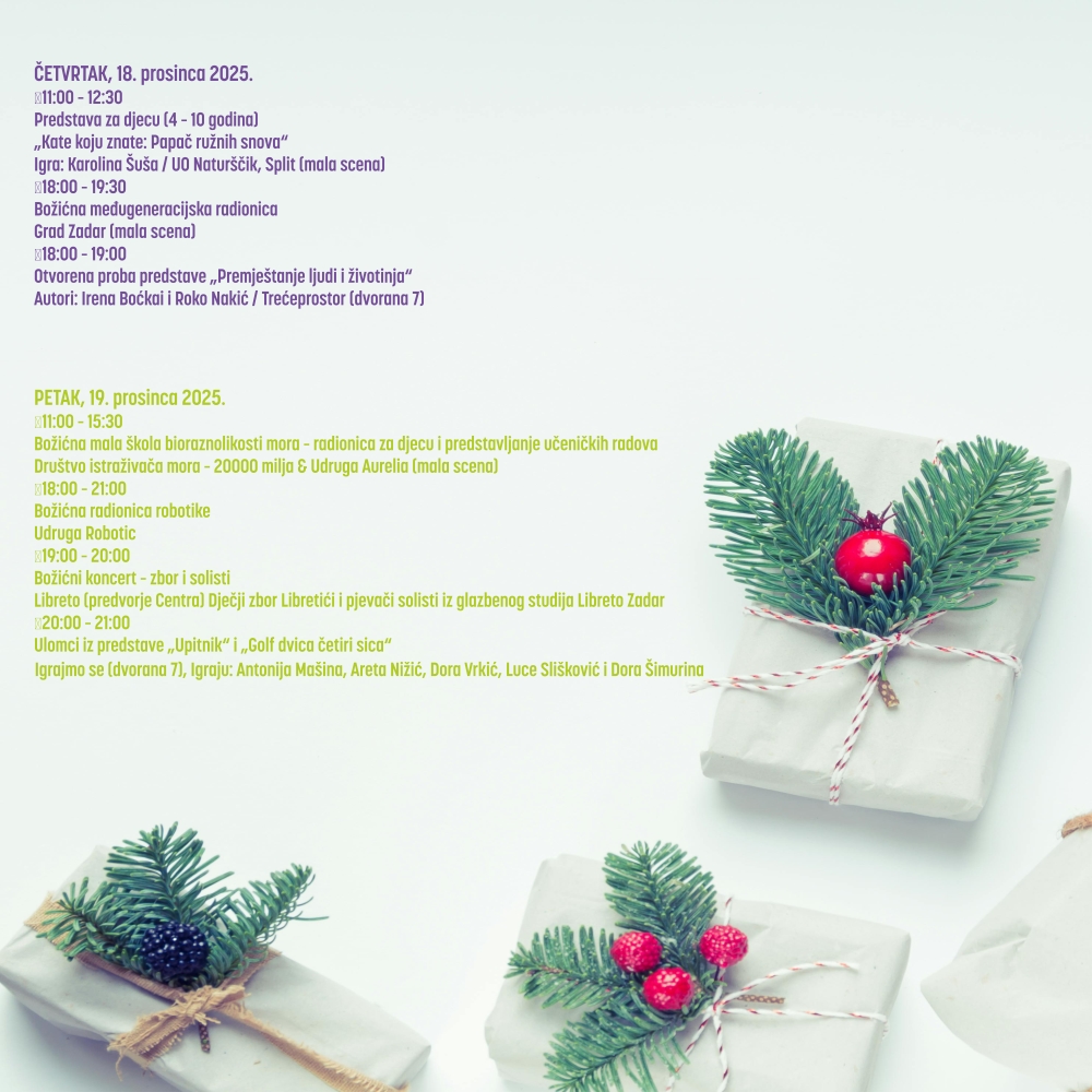 Uoči božićnih blagdana ✨ Centar za mlade Zadar priprema bogat i sadržajan program namijenjen mladima 🧑🤝🧑 i svim zainteresiranim građanima. Od 15. do 22. prosinca 2025. Centar otvara svoja vrata 🚪 kroz radionice, predstave 🎭, koncerte 🎶, plesne 💃🕺 i edukativne programe 📚 te još jednom potvrđuje da je mjesto susreta, kreativnosti 🎨 i zajedništva 🤝.