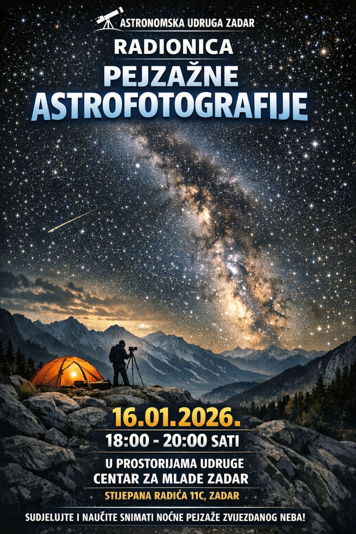 Astronomska udruga Zadar s veseljem najavljuje radionice pejzažne astrofotografije ✨ koje će se održati u petak, 16. siječnja i u subotu 17. siječnja 2026. godine, s početkom u 18:00 sati, u prostoru Centra za mlade Zadar – Mala scena 🎭.